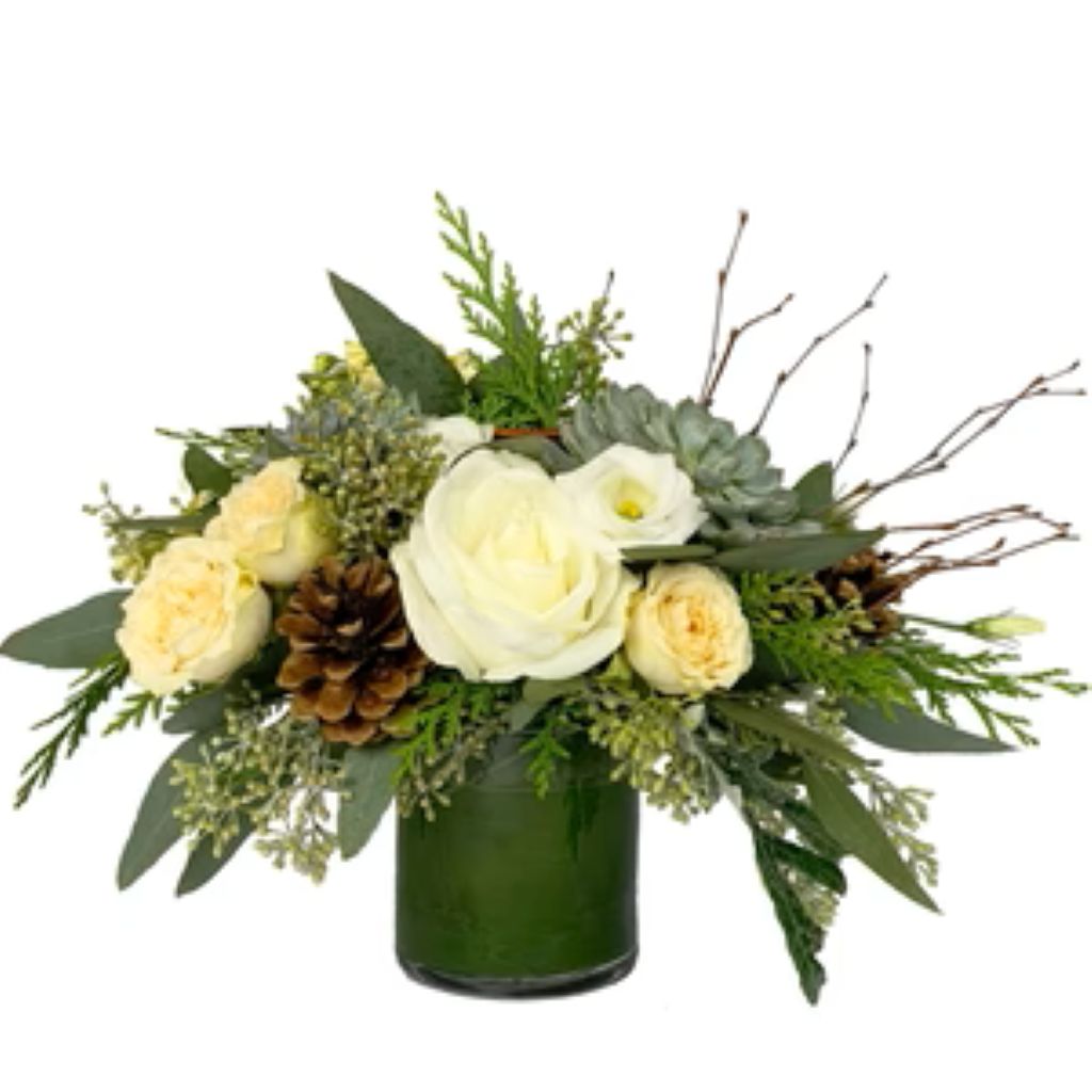 An elegant combination of fresh white winter blooms, accented with seasonal greenery.