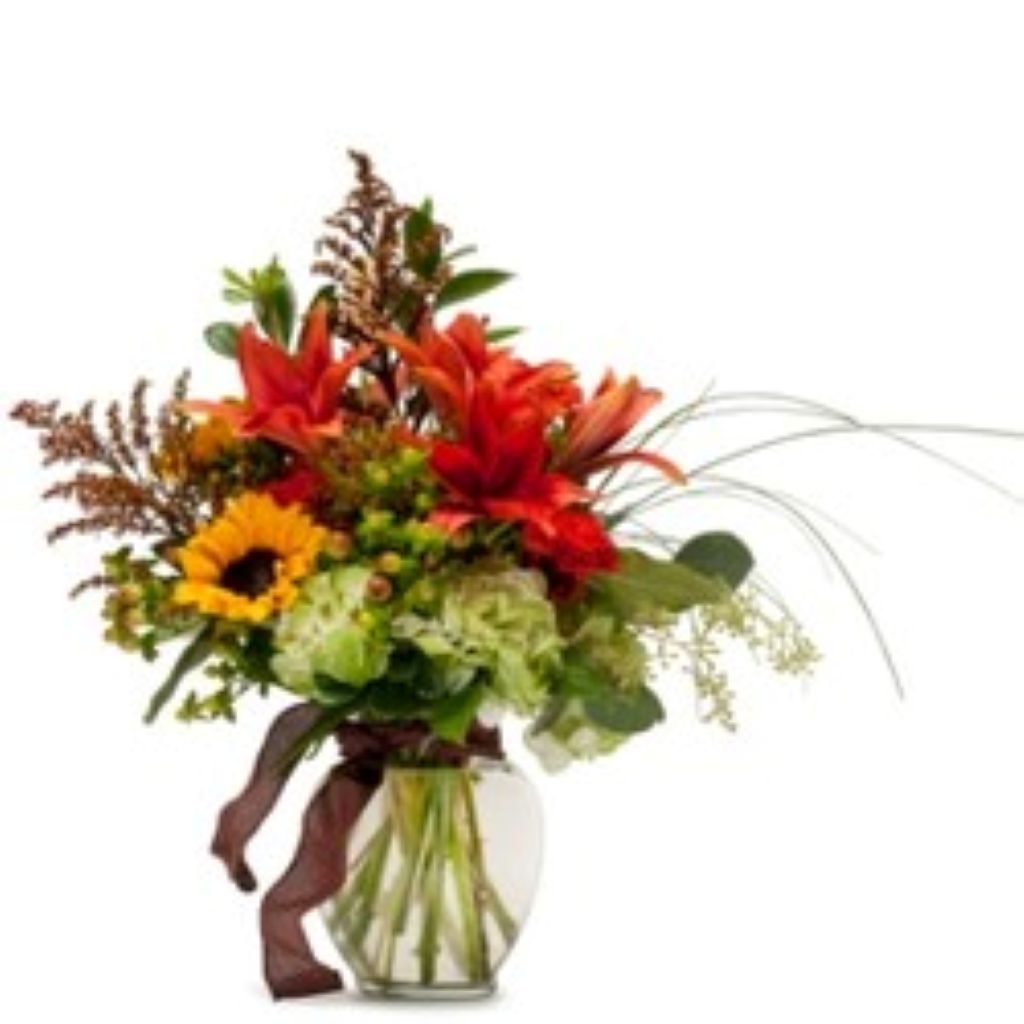 Our Most Popular Design for this time of year is a selection of bright fall colored blooms arranged in a clear vase. Approximately 9" (W) x 12 (H)