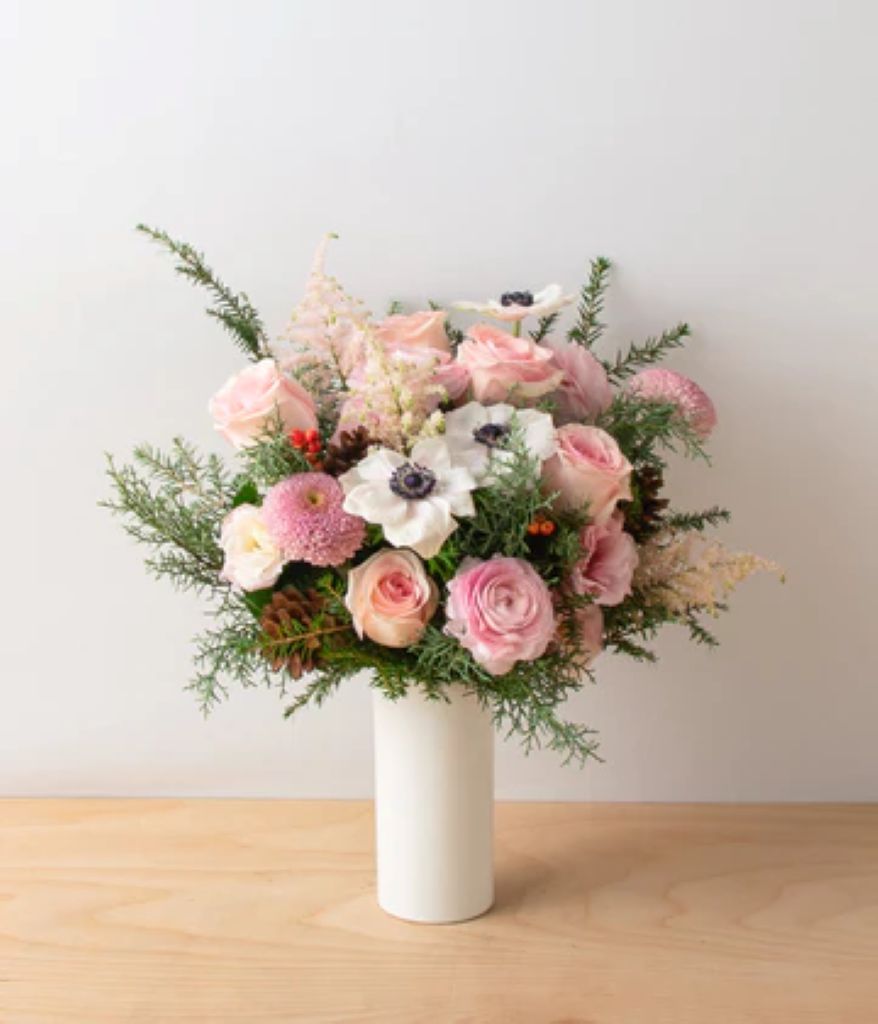A winter twist on the classic blush and pinks palette! Blush Cloni ranunculus, white anemones and roses are accented with pine cones and pink hyacinth in our signature Brooklyn vase.