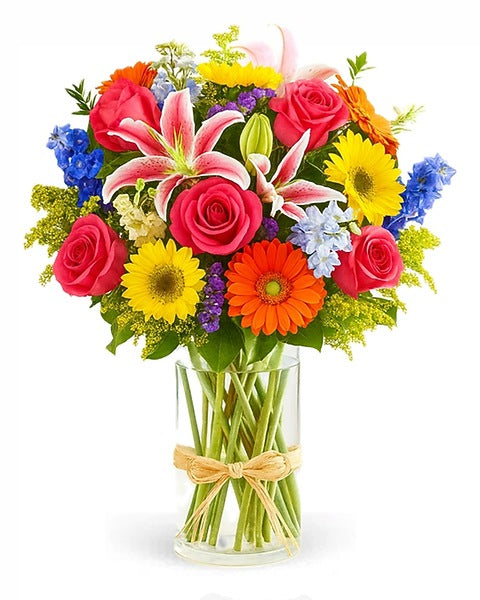 Bold. Uplifting. Unforgettable. Bright Horizon is a joyful floral arrangement bursting with radiant color and personality. Featuring a vivid blend of orange Gerbera daisies, sunflowers, hot pink roses, pink lilies, blue delphinium, purple stock, and green solidago, this large, colorful bouquet is guaranteed to brighten any space and every heart. Perfect for birthdays, celebrations, get-well wishes, or simply to share a moment of happiness, Bright Horizon is a bold, feel-good gift that radiates positivity. Designed in a clear glass vase and handcrafted by our expert florists, this arrangement makes a dramatic and joyful impression from the moment it arrives. Available Sizes: Standard: A vibrant and eye-catching mix of seasonal blooms in a classic glass vase Premium: Includes additional stems and fuller florals for a grander, show-stopping presentation