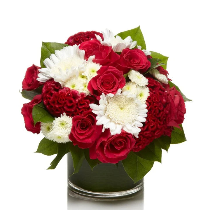A lush design featuring smooth white and cherry red blooms, accented with seasonal greenery. Features of this arrangement: Hand delivered, ready to be enjoyed! Designed in a modern glass vase Personalized gift message Varietals such as roses and daisies will be incorporated into this design pending seasonality, freshness, and availability Our florists use the freshest flowers currently available in their market and therefore your design may vary from the inspiration photo above. If substitutions are required, our designers will strive to achieve the overall style and color palette as pictured.