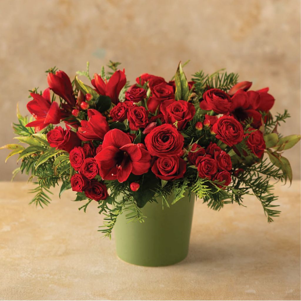 Vibrant, elegant, and brimming with holiday cheer, this festive arrangement includes over a dozen pristine ruby-red roses and spray roses paired with cheerful crimson hypericum berries. Artfully embellished with specialty evergreens and showcased. You deserve the best. If an item is unavailable, we’ll sub in products of equal or greater value.