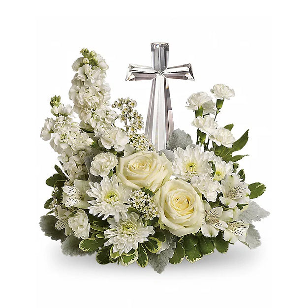 An elegant display of faith and divine peace, this beautiful arrangement will comfort the bereaved in a truly thoughtful and respectful way. An exquisite crystal cross is surrounded by a bed of lovely blossoms. It is sure to be appreciated and always remembered.