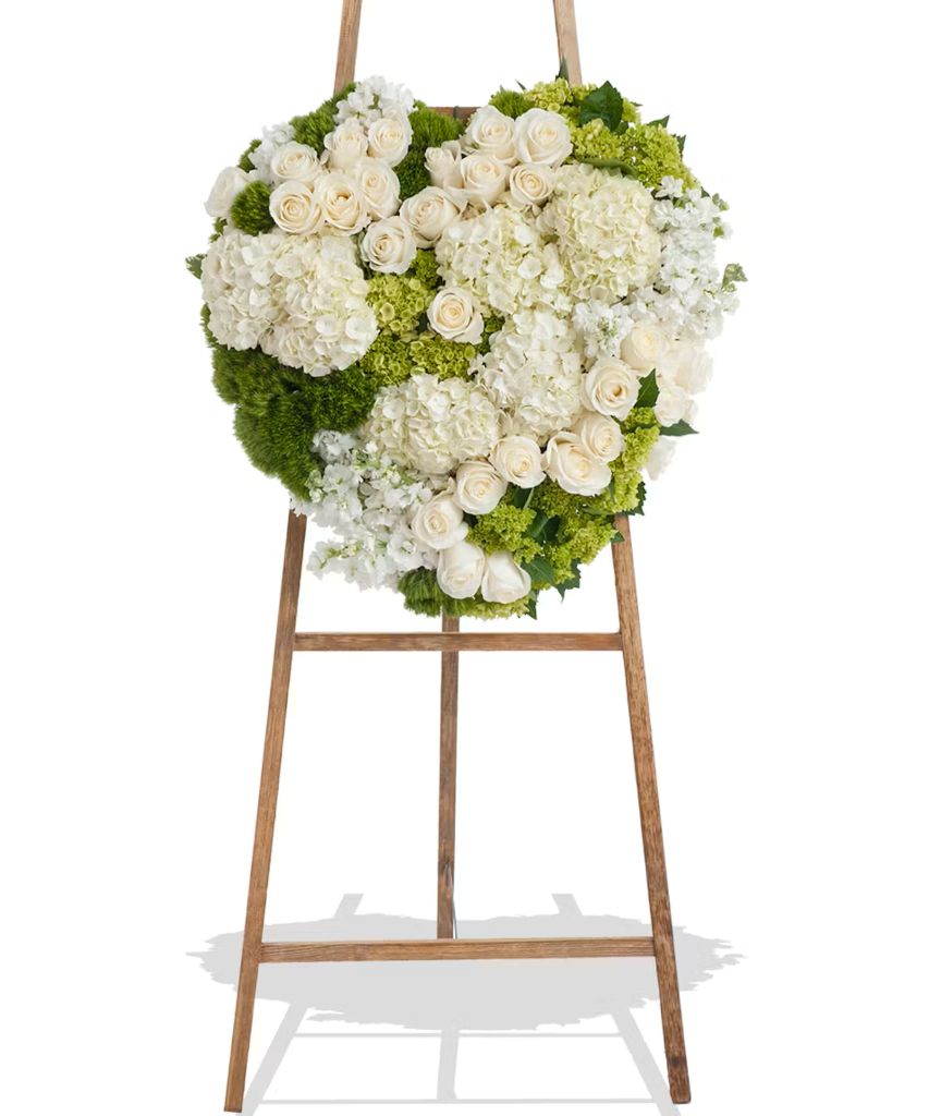 The Elegant White Heart Stand is a touching floral tribute, expertly shaped into a heart to represent enduring love, innocence, and compassion. This all-white design, part of North Star Blooms Elegant White Funeral Suite, brings emotional resonance and elegant beauty to memorial and funeral services.