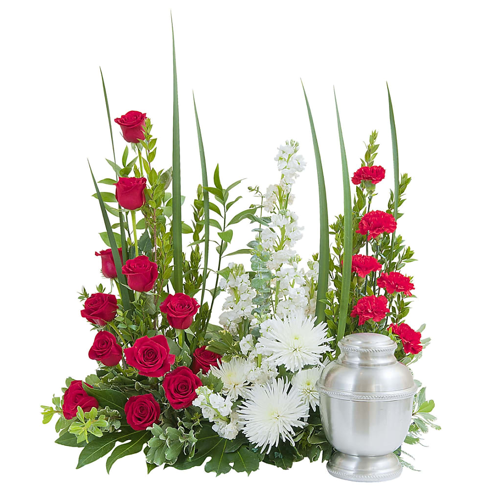 This beautiful selection of red and white flowers and foliage create a stately backdrop for the urn. Approximately 24" wide 8" deep