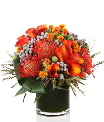 A lively combination of orange and red blooms, accented with seasonal berries and modern greenery. Our florists use the freshest flowers currently available in their market and therefore your design may vary from the inspiration photo above. If substitutions are required, our designers will strive to achieve the overall style and color palette as pictured.