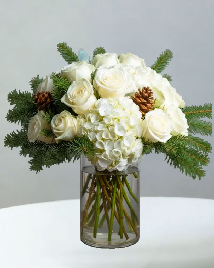 This fresh flower bouquet features white roses, white hydrangea, pine cones and seasonal accents.