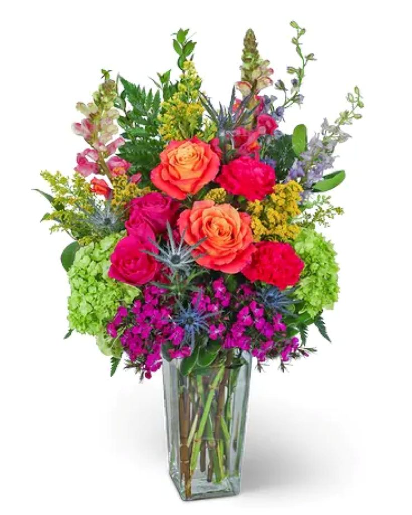 Step into a world of blooming beauty with our Garden Party flower design. This exquisite arrangement showcases a delightful medley of roses, hydrangeas, carnations, snapdragons, larkspur, and other premium blooms and foliage. Order now and bring the beauty and spirit of a garden party into your home or make it a memorable gift for someone special. Approximately 24” H x 15” W