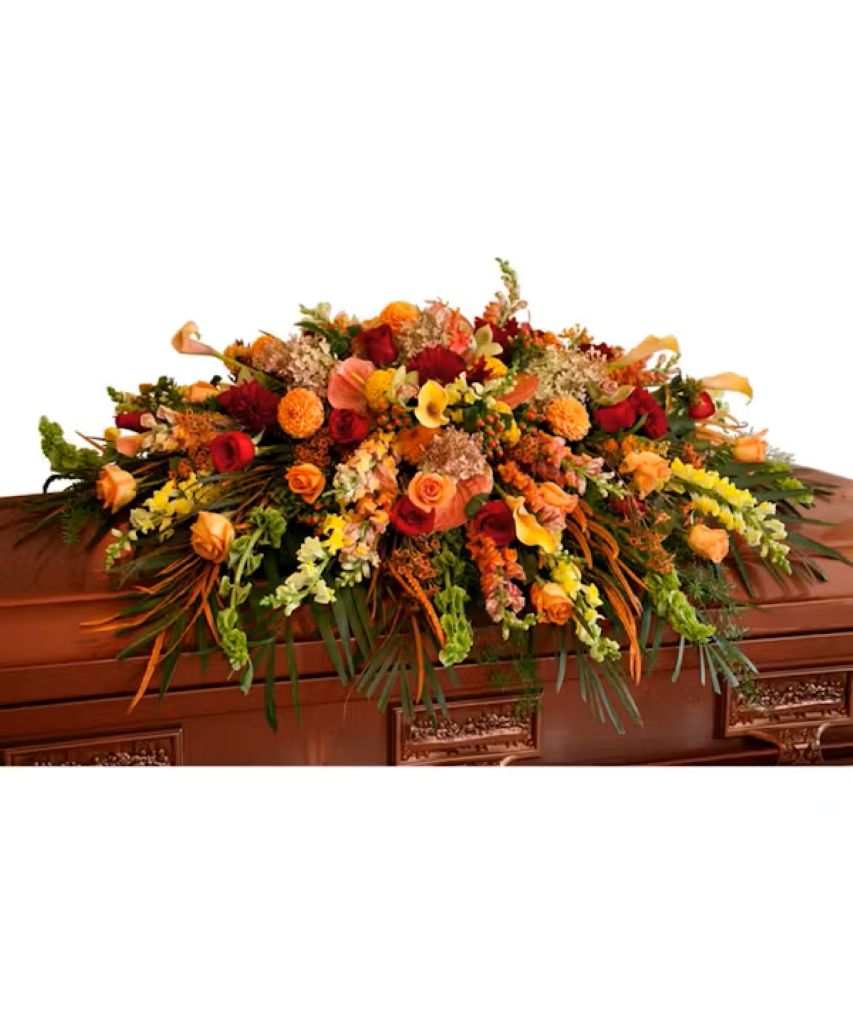 A beautiful casket spray displaying seasonal colors with delicate touches of soft greenery. Multiple sizes are shown- choose your favorite. Dimensions may vary.