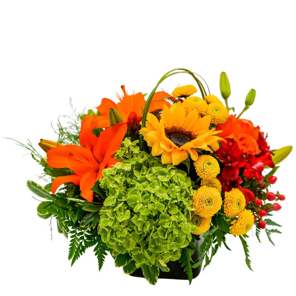 Mother Nature is showing off. Harvest Earth celebrates the bountiful beauty of the season. Vibrant fall colors of flowers like lilies, hydrangea, and sunflowers will pop in this compact arrangement. Approximately 14"W X 14"H