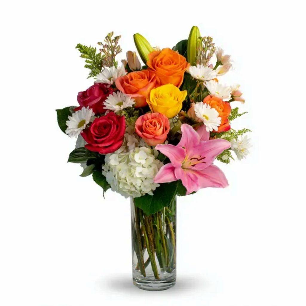 Radiating the warmth of a heartfelt sunrise, this spirited Valentine’s bouquet is filled with joyful orange, red, and yellow roses, playful daisies, and a striking pink lily. Designed in a tall, elegant vase, it’s a bright and modern twist on classic romance.