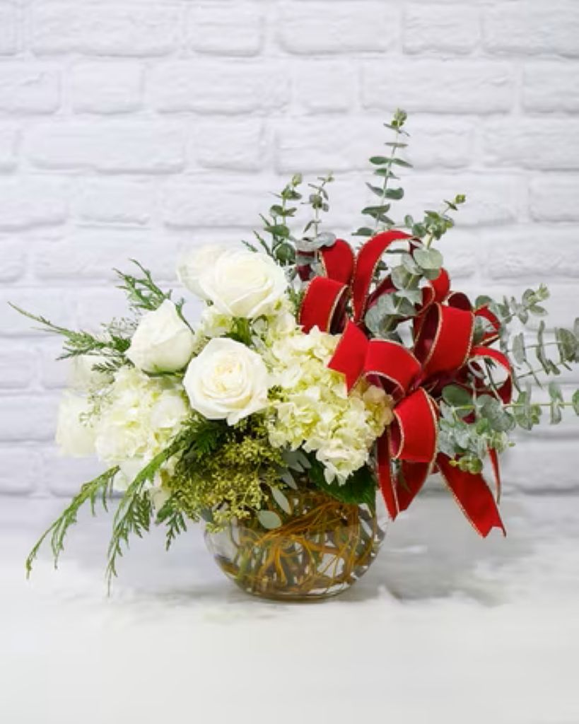 Lush white hydrangea and creamy roses create a soft, winter-white base, while velvety red ribbon loops add that signature, luxurious RL charm. Eucalyptus and seasonal evergreens give the design movement, texture, and a timeless lodge-inspired feel.