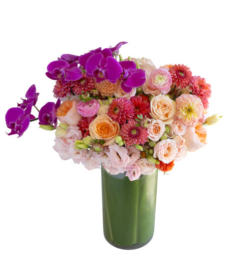 A luxurious tall arrangement in bright pink and peach hues, designed to make a lasting impression.