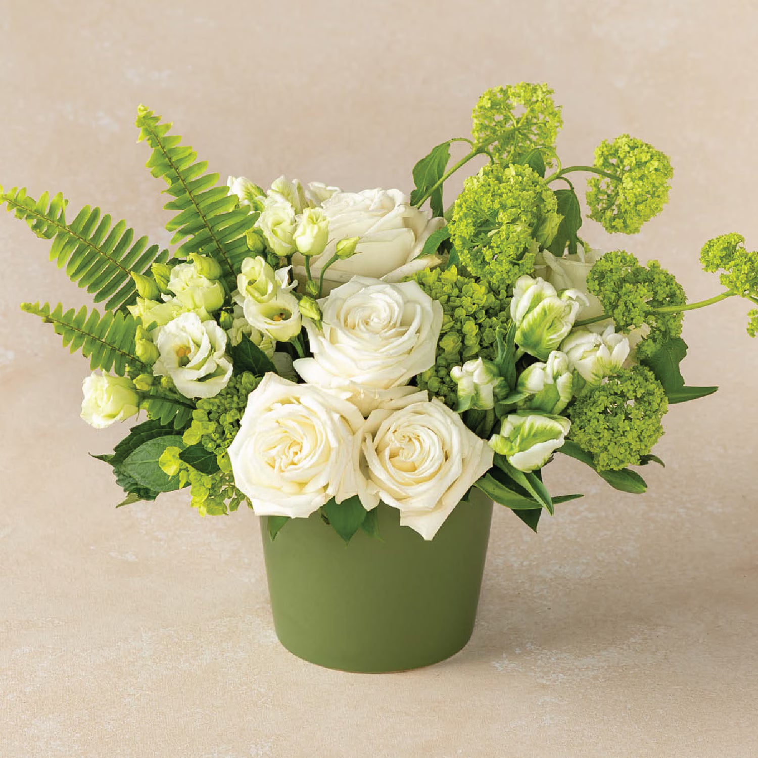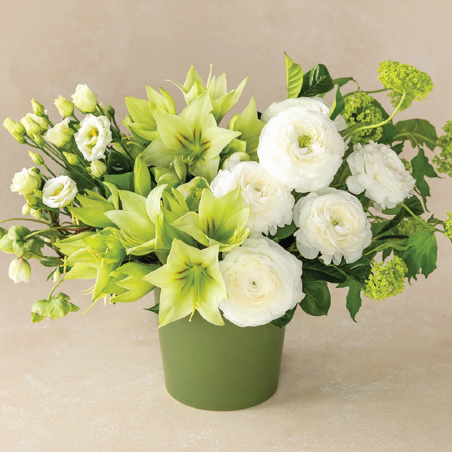 Organic, ornate, and unforgettable. This verdant design includes glowing paper-white ranunculus, delicate ivory lisianthus, and curving helleborus 'Winterbells' nestled among pops of viburnum and glossy stems of greenery. Beautifully arranged. You deserve the best. If an item is unavailable, we’ll sub in products of equal or greater value.