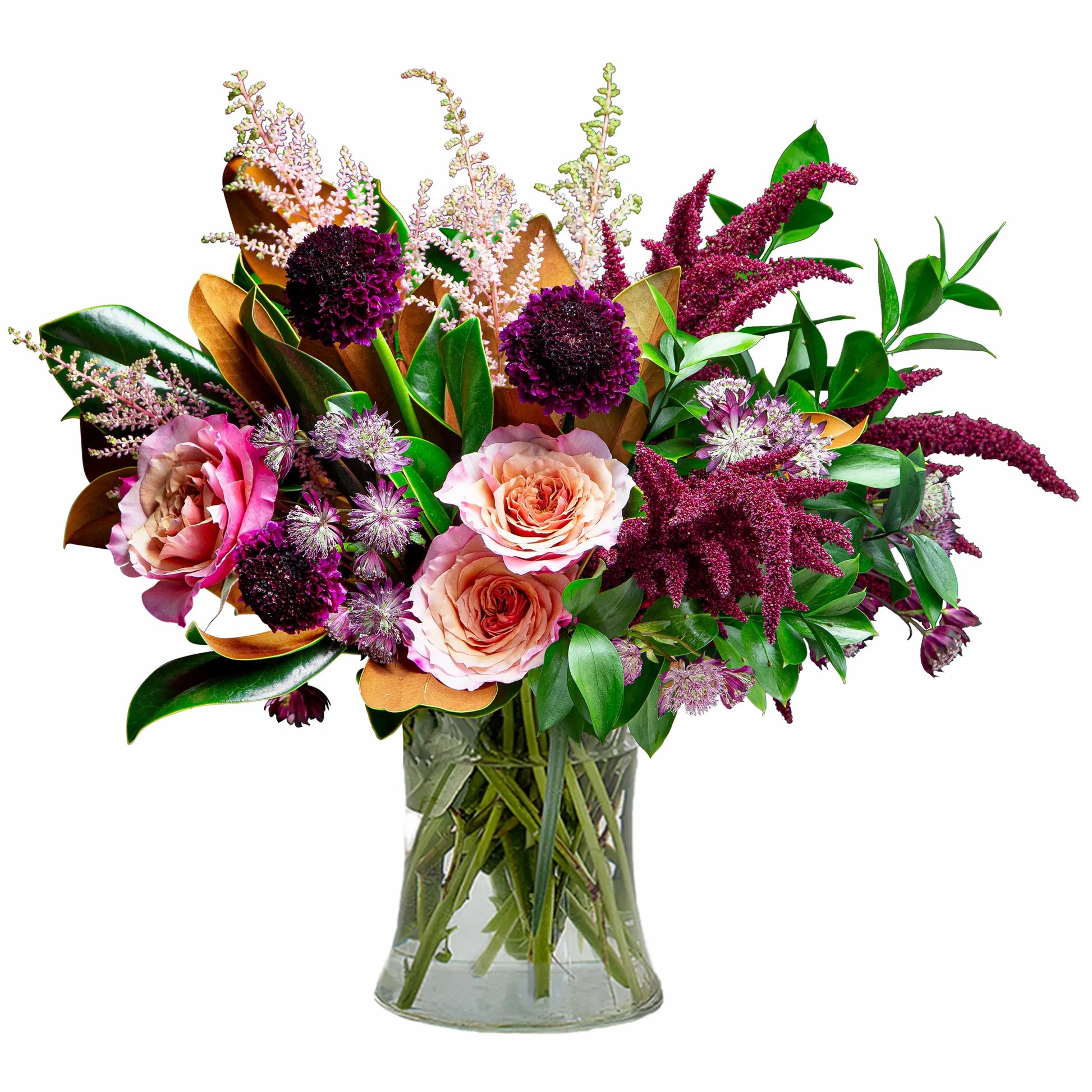 Japanese garden roses with astilbe, Amaranthus and scabiosa overflow with fall promises of cooler days and warmer homes. Suitable for any occasion, this floral arrangement will boast with sentiments of love to the recipient. Approximately 18"W X 18"H Product ID: TMF-1416C