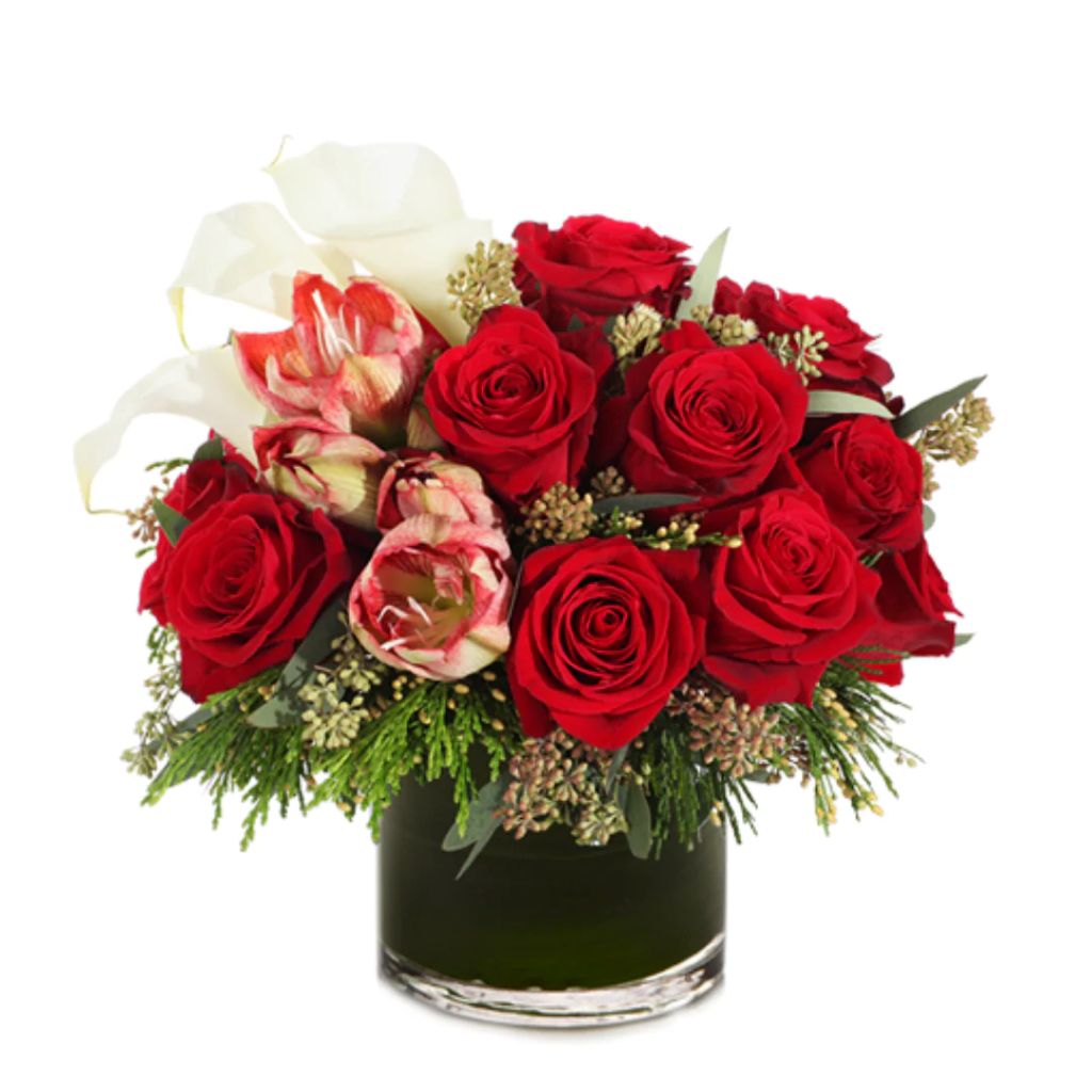 A luxurious holiday combination featuring fresh red and white blooms, accented with seasonal pines and greenery.