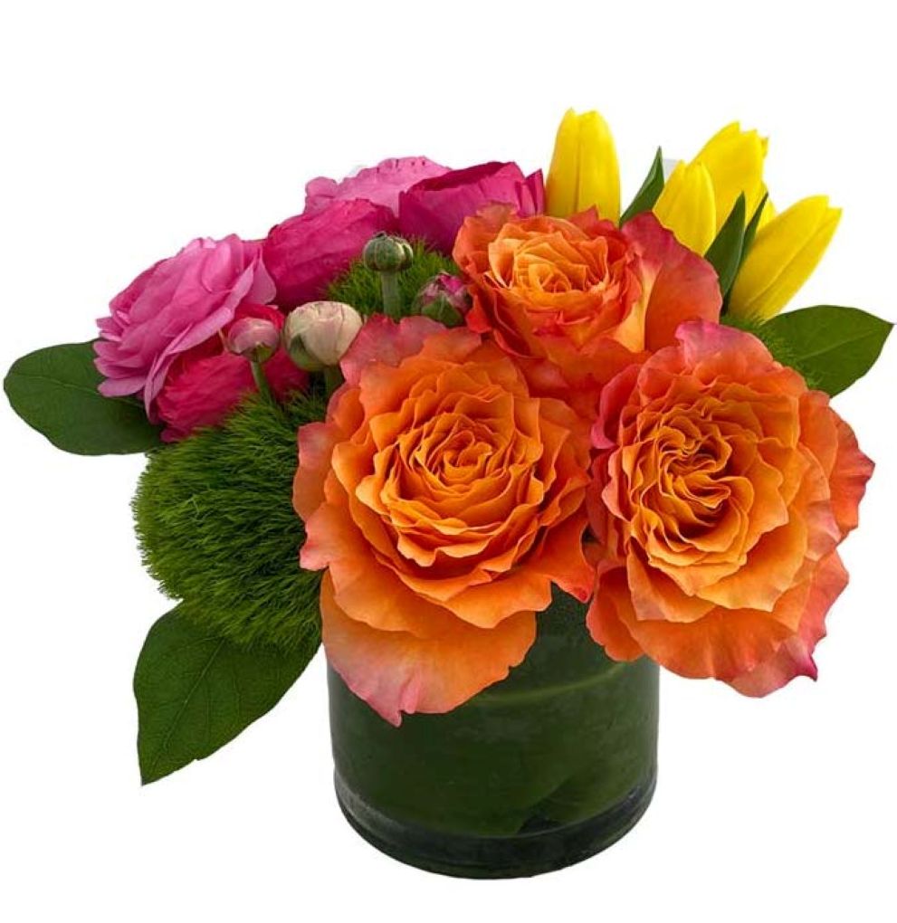 One of our Exclusive collaboration designs, featuring bright orange roses paired with bold pink and yellow blooms. Features of this arrangement: Hand delivered, ready to be enjoyed! Designed in a modern glass vase Personalized gift message Varietals such as roses, ranunculus, and tulips will be incorporated into this design pending seasonality, freshness, and availability Our florists use the freshest flowers currently available in their market and therefore your design may vary from the inspiration photo above. If substitutions are required, our designers will strive to achieve the overall style and color palette as pictured.