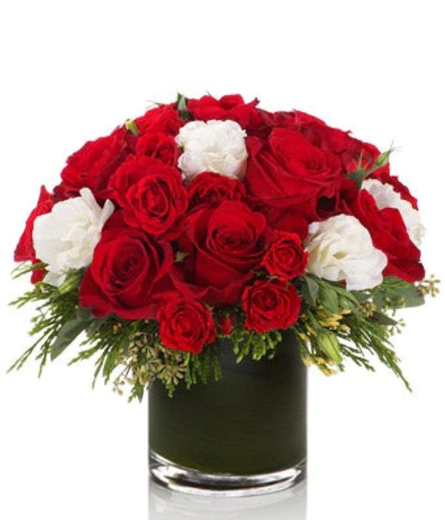 A festive combination of fresh red and white blooms, accented with seasonal pines.