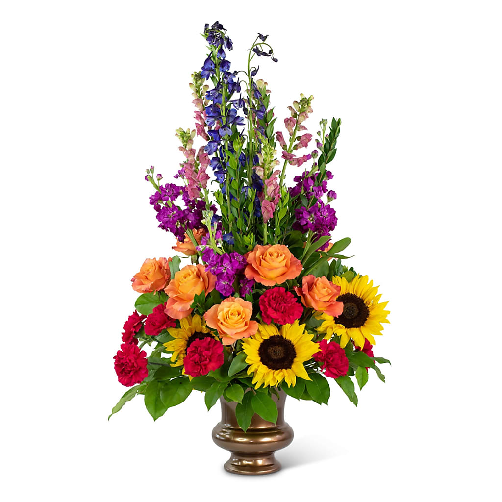 Celebrate vivid memories with The Prismatic Rays Tribute. Carnations, Snapdragons, Stock, Delphinium, Sunflowers and Roses convey your wishes of sympathy and comfort to the grieving family. Approximately 31"H X 16"W