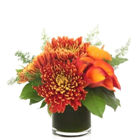 A warm, autumnal arrangement featuring seasonal orange and copper blooms, lightly accented with greenery. Our florists use the freshest flowers currently available in their market and therefore your design may vary from the inspiration photo above. If substitutions are required, our designers will strive to achieve the overall style and color palette as pictured.