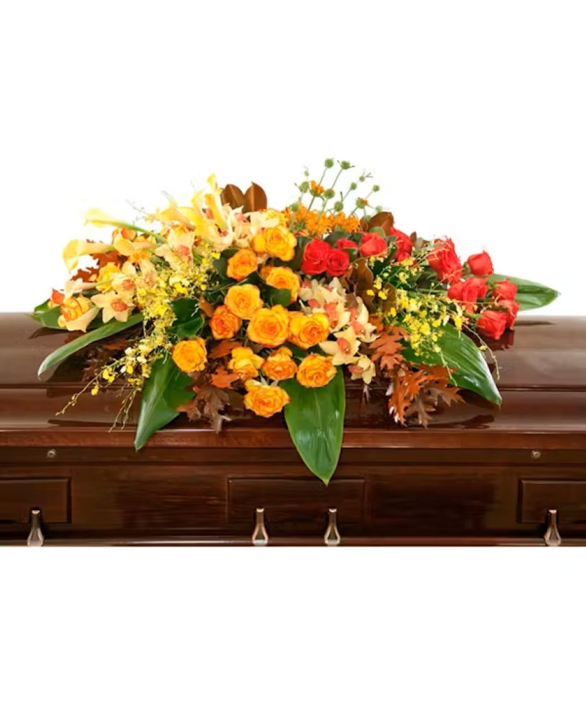 A beautiful casket spray designed with hues of orange, yellow, and red. Multiple sizes shown- choose your favorite! Dimensions may vary.