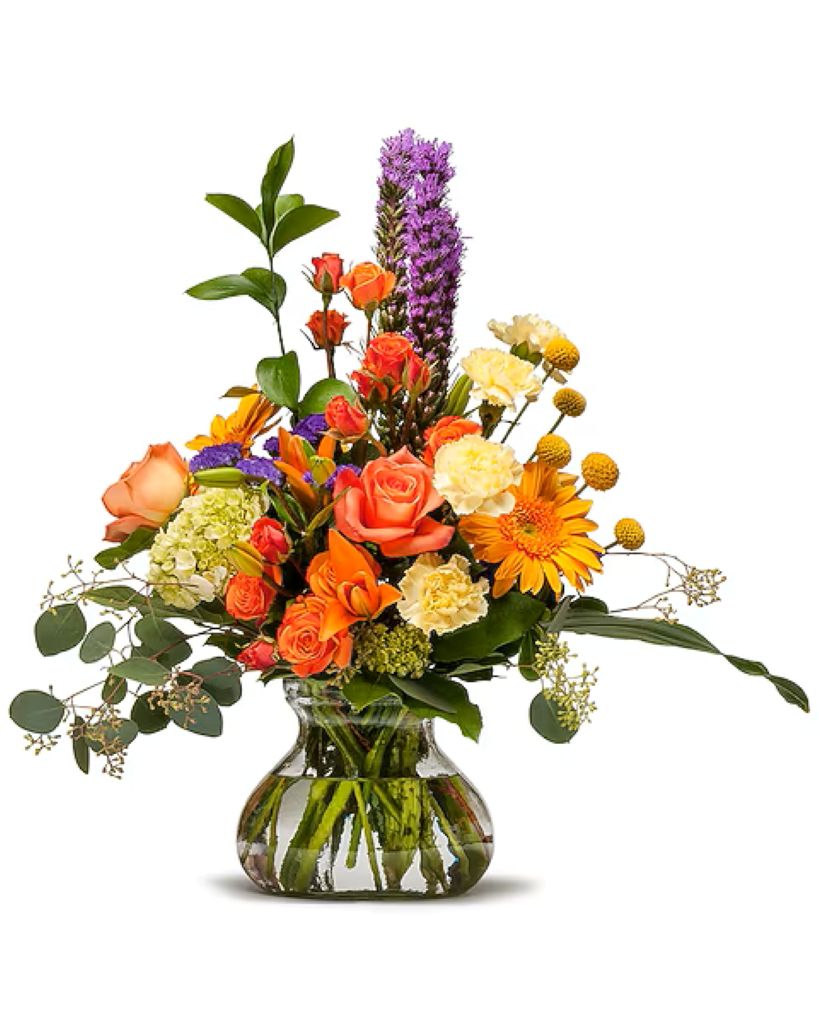 Our Super Premium Design is overflowing with style and filled with bright fall colored premium flowers. Beautiful Asiatic Lilies, classic and elegant Spray Roses, bold Carnations, and Gerbera favorites, plus additional lush flowers and greenery to make Shimmering Papaya a colorful, full, more than perfect gift of flowers for a birthday, a way to say “thank you,” Father’s Day, or any other summer and fall occasion.