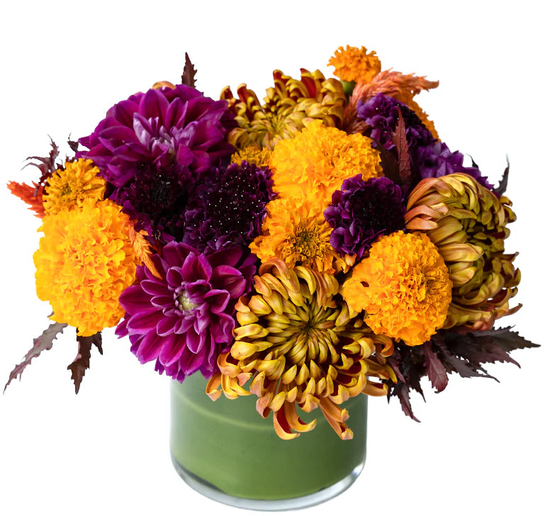 A fun and enchanting design featuring seasonal fall blooms in vibrant orange, purple, and bronze.