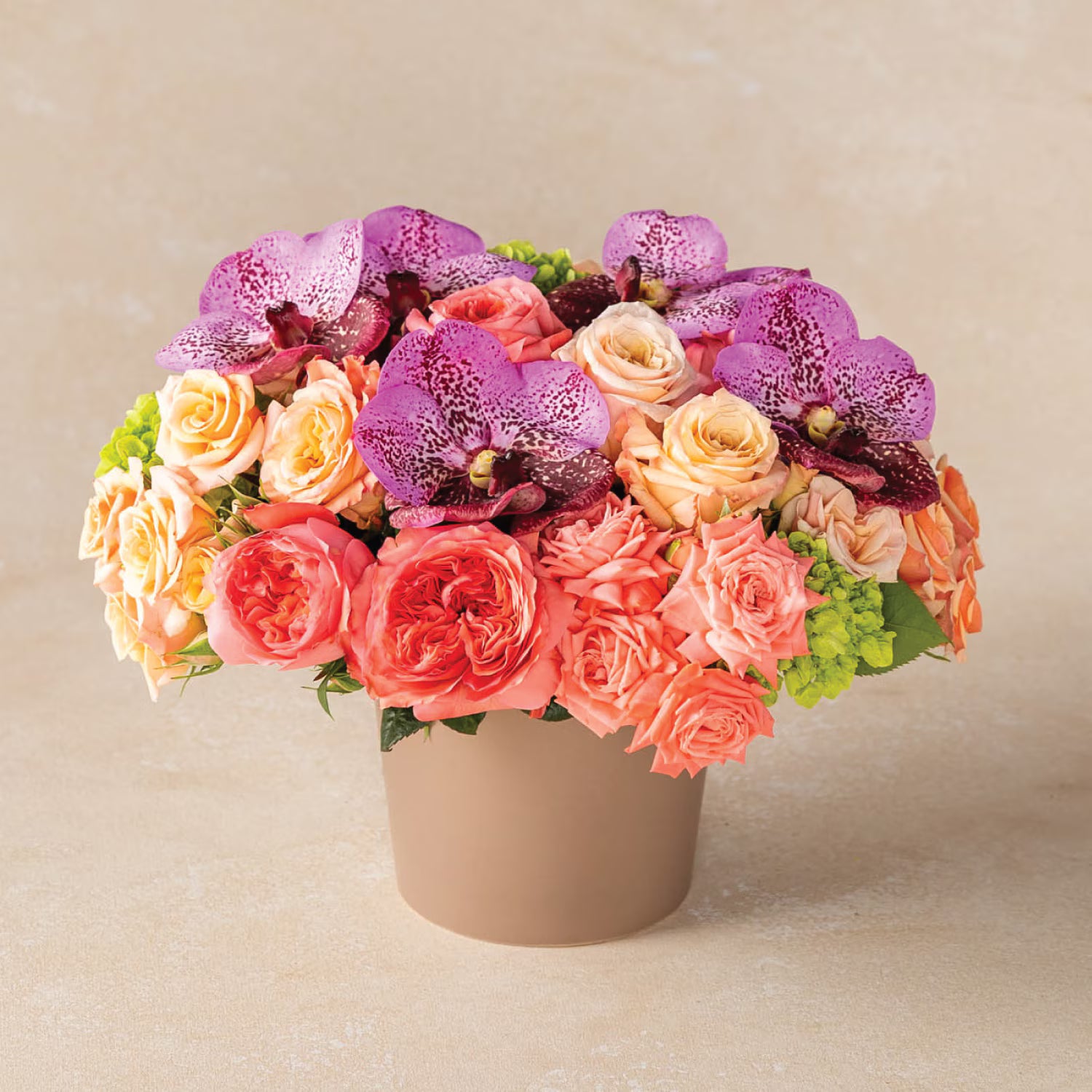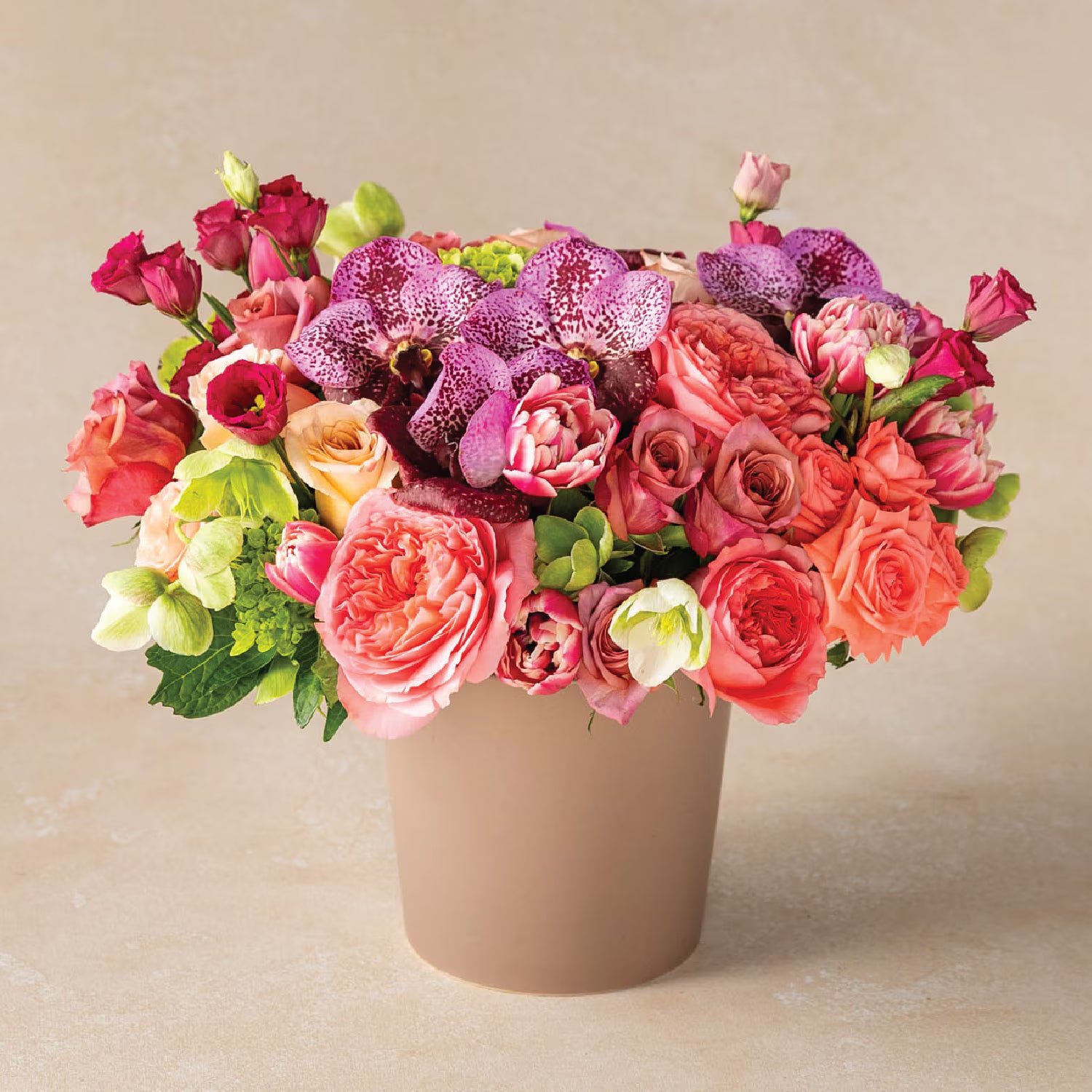 Brighten winter days with a sweet selection of seasonal blooms. A variety of coral- and champagne-colored roses pair perfectly with fuchsia vanda orchids and shimmering helleborus 'Winterbells'. Embellished with miniature hydrangea and glossy foliage in a rosy-taupe vase. You deserve the best. If an item is unavailable, we’ll sub in products of equal or greater value.