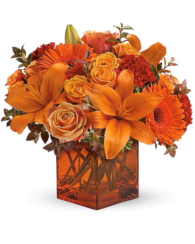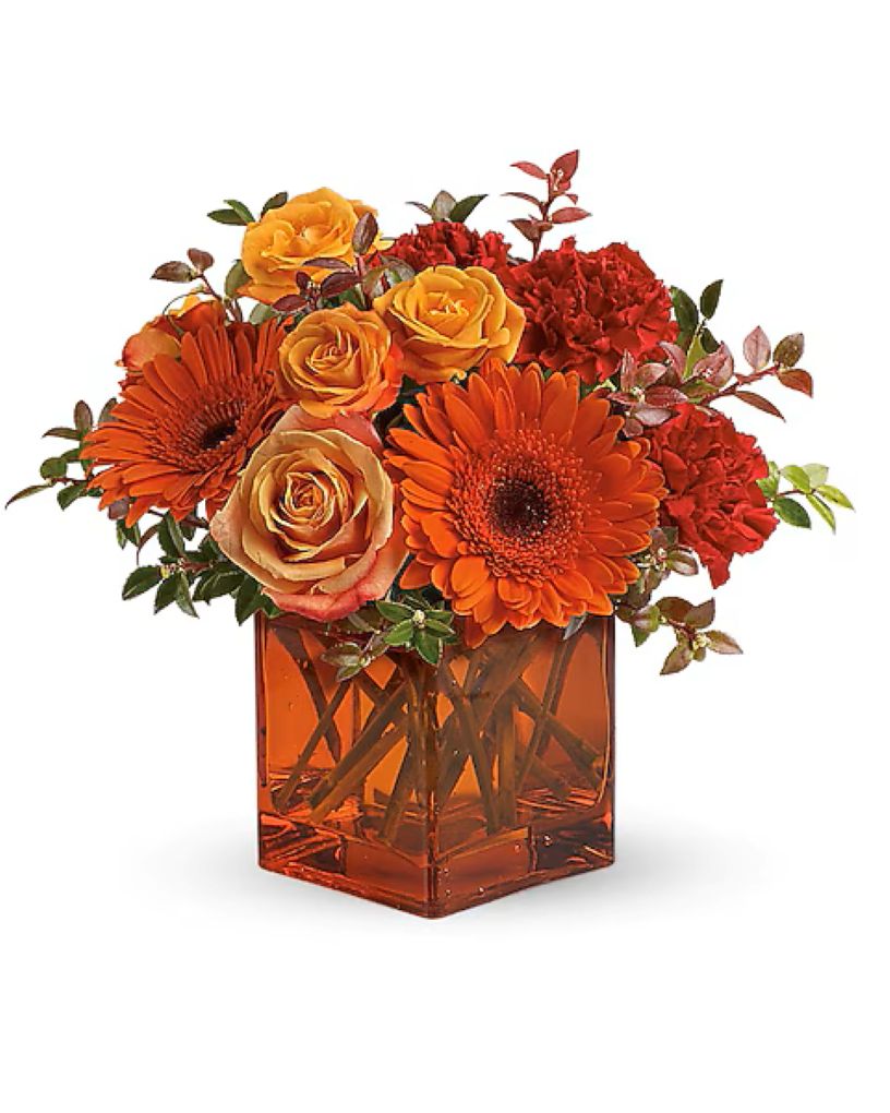 Sunrise, sunset, swiftly fly the days. So don't let another day go by without letting someone you know that you are thinking of them. This delightful arrangement will brighten anyone's morning, noon and night. Fiery orange roses, spray roses and gerberas plus red carnations and huckleberry, are arranged in an exclusive orange cube vase. This arrangement is bound to get glowing reviews and thank-yous!