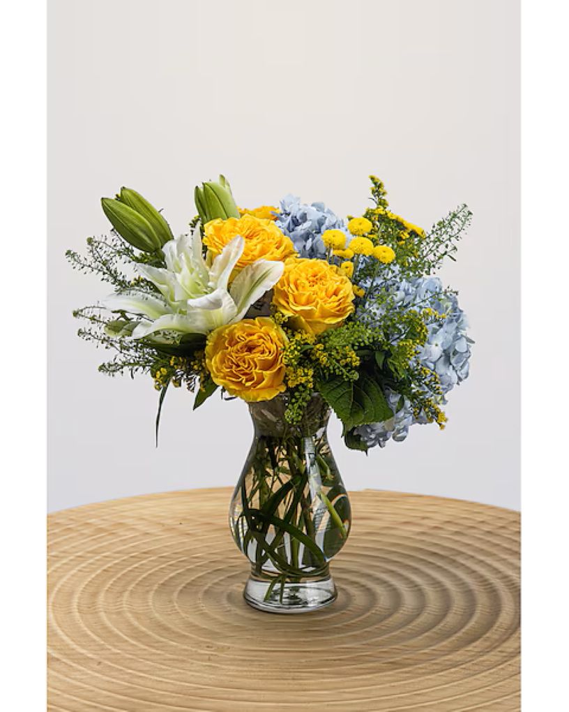Bask in nature’s glow and allow the Skylight flower arrangement to illuminate your love and friendship! Get ready to chase the sun with bright yellow and blue blooms delivered right to your or your recipient’s door. These luxe flowers are perfect for anniversaries, birthdays, and any special occasion. Transform your or your recipient’s space with Skylight flowers today! You'll grow to love our fast and dependable local flower delivery service in your area. Same-day and next-day local flower delivery is usually available.