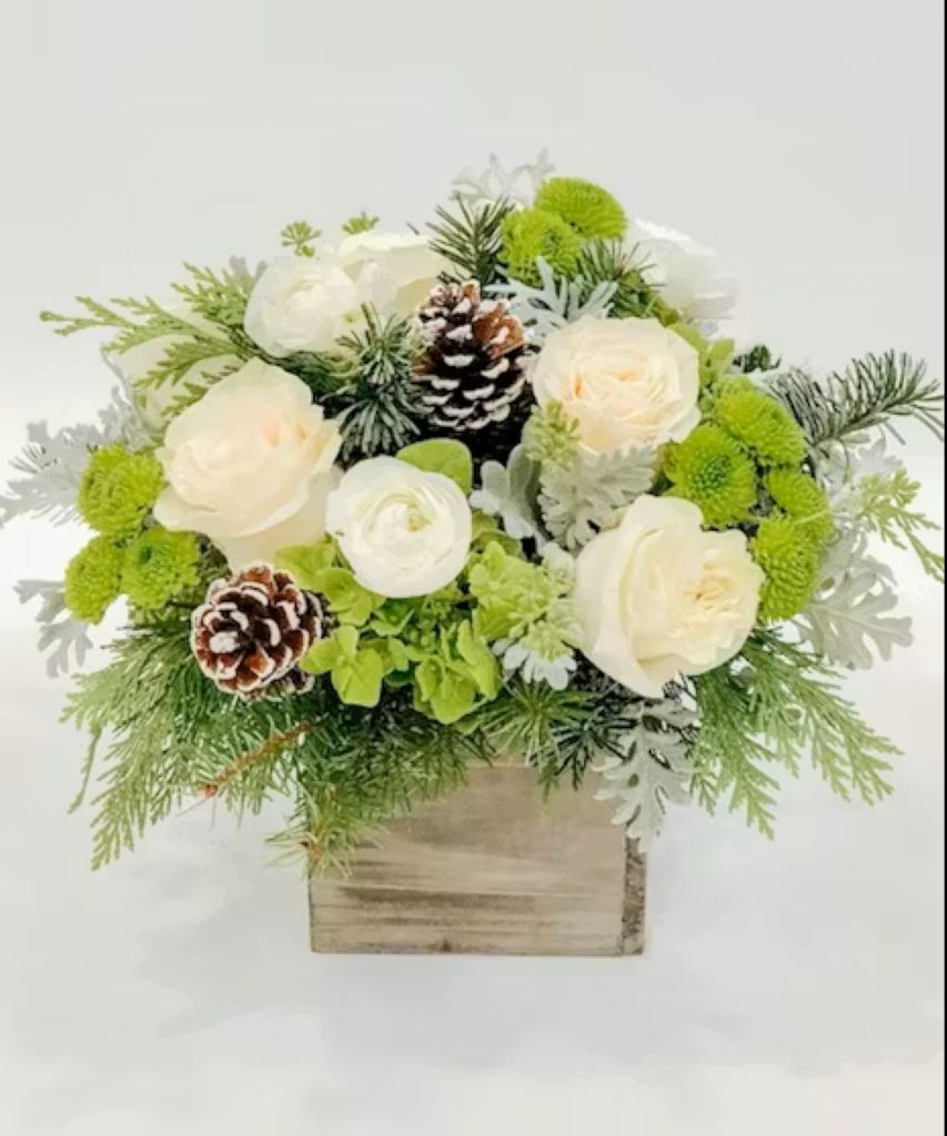 The "White in the Woods" bouquet is a serene and elegant arrangement that captures the quiet beauty of a forest blanketed in fresh snow. Presented in a box vase, this bouquet combines crisp whites and soft greens with natural accents, creating a peaceful and enchanting display perfect for any occasion.