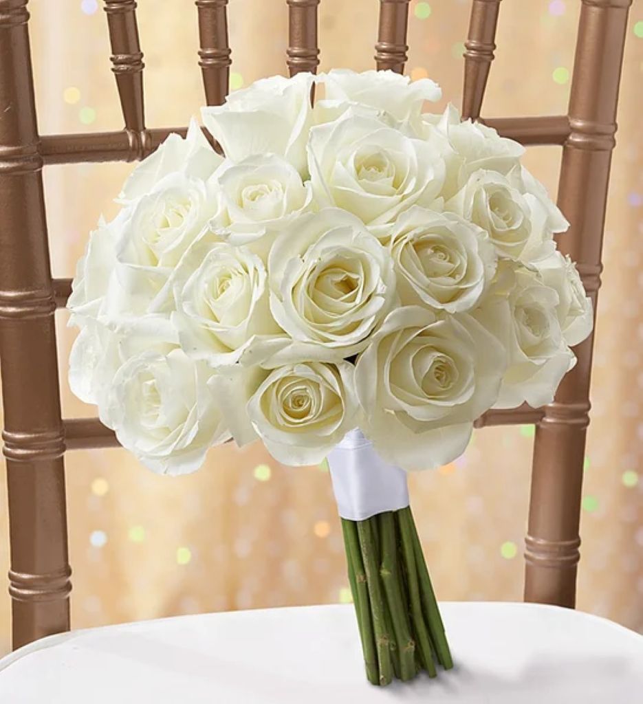 About White Rose Bouquet We’ve captured all the joy and happiness of new beginnings into one blissful bouquet! Filled with a fresh gathering of crisp white roses, our florists take extra special care, hand designing each arrangement to make every bride smile on her special day. Tied with matching satin ribbon and available in three sizes for each member of the bridal party.