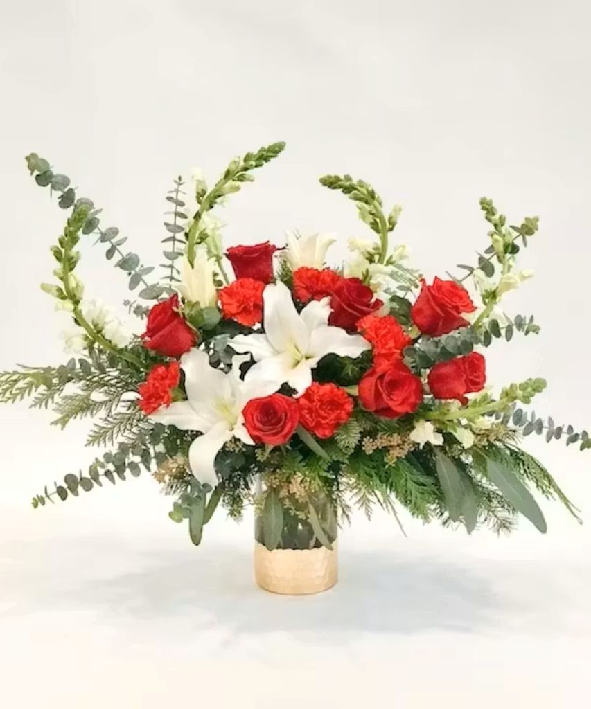 The "Wonderland" bouquet is a luxurious and festive arrangement that evokes the magic of a snow-kissed landscape. Presented in a gold scalloped cylinder vase, this bouquet blends rich reds, pristine whites, and lush evergreens, creating a truly enchanting centerpiece perfect for the holiday season or any special celebration.